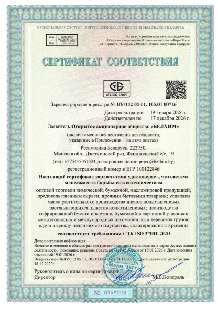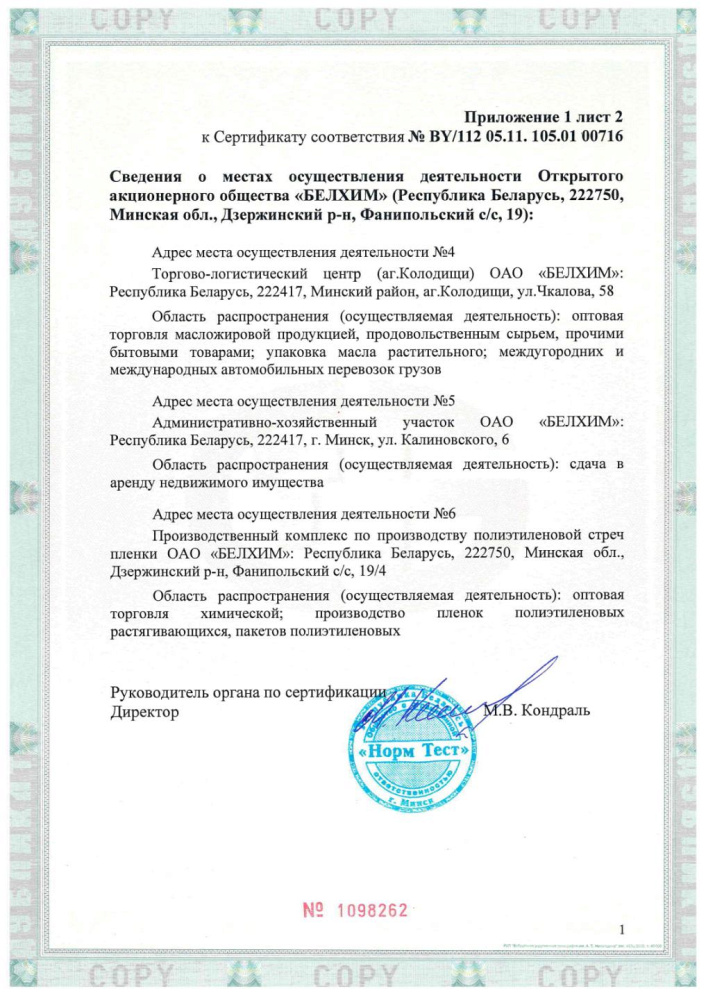 Настоящий сертификат соответствия удостоверяет, что система менеджмента качества оказания услуг по оптовой торговле химической, масложировой продукцией, продовольственным сырьем; упаковки масла растительного; производства пленок полиэтиленовых растягивающихся, пакетов полиэтиленовых; междугородних и международных автомобильных перевозок грузов соответствует требованиям СТБ ISO 9001-2015.