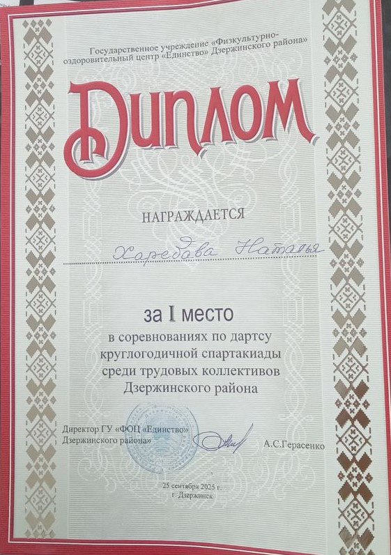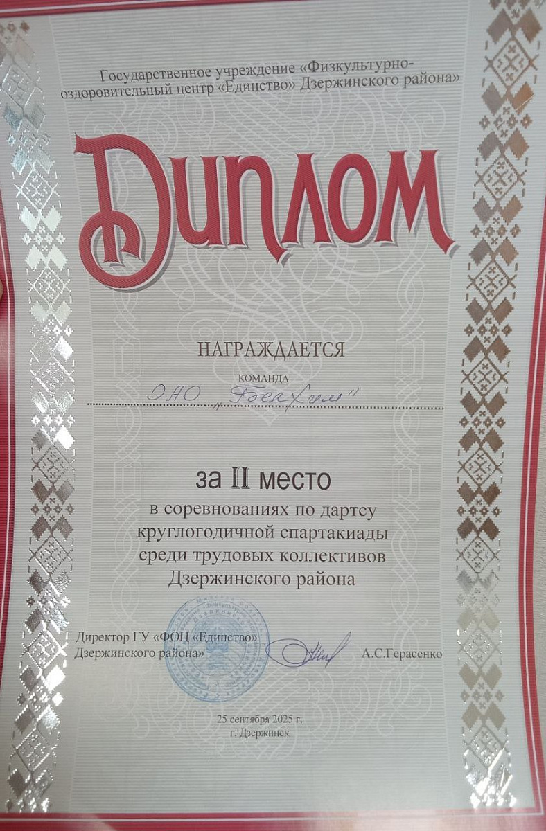 25 сентября 2025 года команда ОАО «БЕЛХИМ» в составе: Натальи Харебава и Андрея Рацкевича успешно приняла участие в соревнованиях по дартсу круглогодичной спартакиады среди трудовых коллективов Дзержинского района, завоевав ВТОРОЕ МЕСТО.