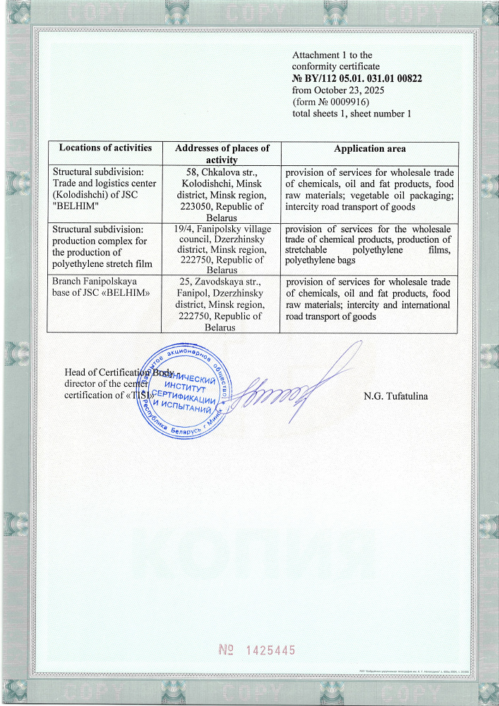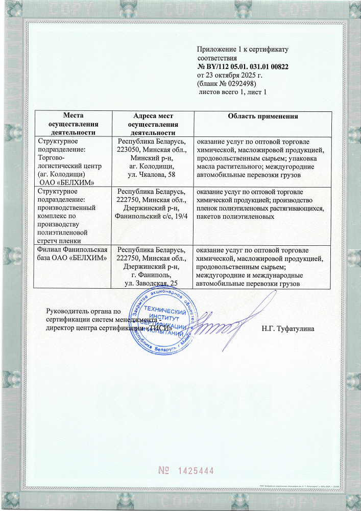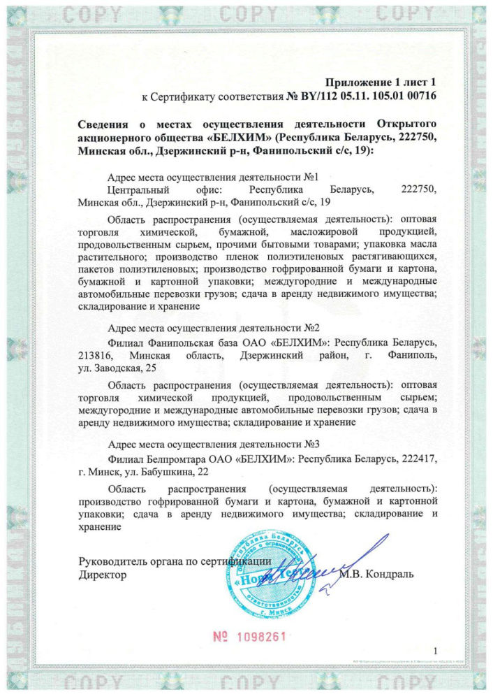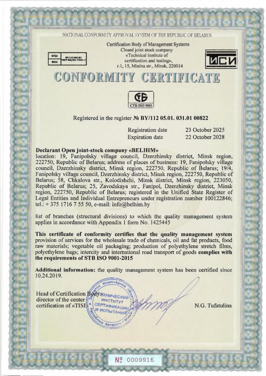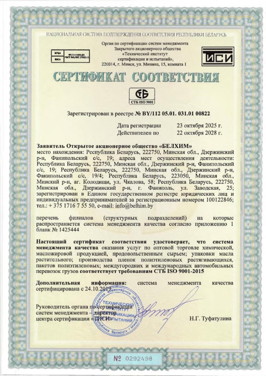 Настоящий сертификат соответствия удостоверяет, что система менеджмента качества оказания услуг по оптовой торговле химической, масложировой продукцией, продовольственным сырьем; упаковки масла растительного; производства пленок полиэтиленовых растягивающихся, пакетов полиэтиленовых; междугородних и международных автомобильных перевозок грузов соответствует требованиям СТБ ISO 9001-2015.